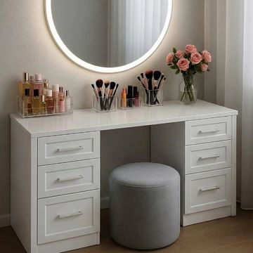 Özel tasarım makyaj masası modellerimiz, makyaj ve bakım rutinlerinizi daha konforlu hale getiren ergonomik ve şık çözümler sunar. Akıllı depolama alanları ve modern tasarım detaylarıyla yaşam alanınıza hem estetik hem de düzen katar.